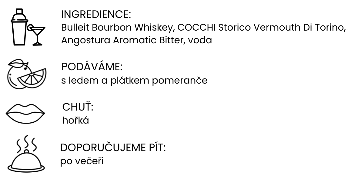 Hřejivost whisky Bulleit Bourbon a sladkost vermutu Cocchi vytváří dokonalou symfonii chutí.