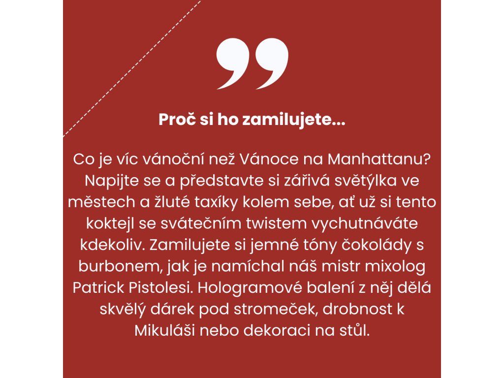 Díky kombinaci Bulleit Bourbonu a italského Vermutu s hedvábně krémovým kakaovým likérem, je tento hřejivý koktejl nádherně jemný. Tento koktejl, který je variací na klasický Manhattan s lákavou sváteční vůní, vám jistě připomene kouzlo Vánoc v New Yorku. Profesionálně namíchaný v italském Miláně.